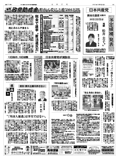 激増・政党助成金―県内6党に2億5,000万円。税金で選挙