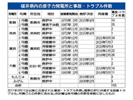 福井県内の原発は15基のうち、廃炉決定と審査不合格を除く全7基が再稼働(高浜2号機は定期検査中)。全国で再稼働した原発(14基)の半数が集中し、全国で最も危険な地域と言われています。 「滋賀民報」が調べてみると、福井の原発では直近5年間に事故やトラブルが多発していました。昨年1年間だけでも、▽排気筒から放射性ガスが漏えい(2月=大飯3号機)、▽作業員が放射性物質を含んだ水のプールに落下(4月=高浜3号機)、▽非常用ディーゼル発電機などの冷却水が約600リットル漏出(6月=敦賀2号機)、▽放射性物質トリチウムを含んだ水が漏れ出す(12月=廃炉作業中のふげん)と、どれも過酷事故につながりかねないトラブルばかり。再稼働中の高浜1号機は運転開始から50年を超え、稼働中の原発では国内最古。配管の老朽化による破損で11人が死傷する事故(04年)を起こした美浜3号機など、長期稼働による施設の劣化が深刻ですが、事故の多くは作業員の不注意や操作ミスなど人為的なものとして処理されています。
